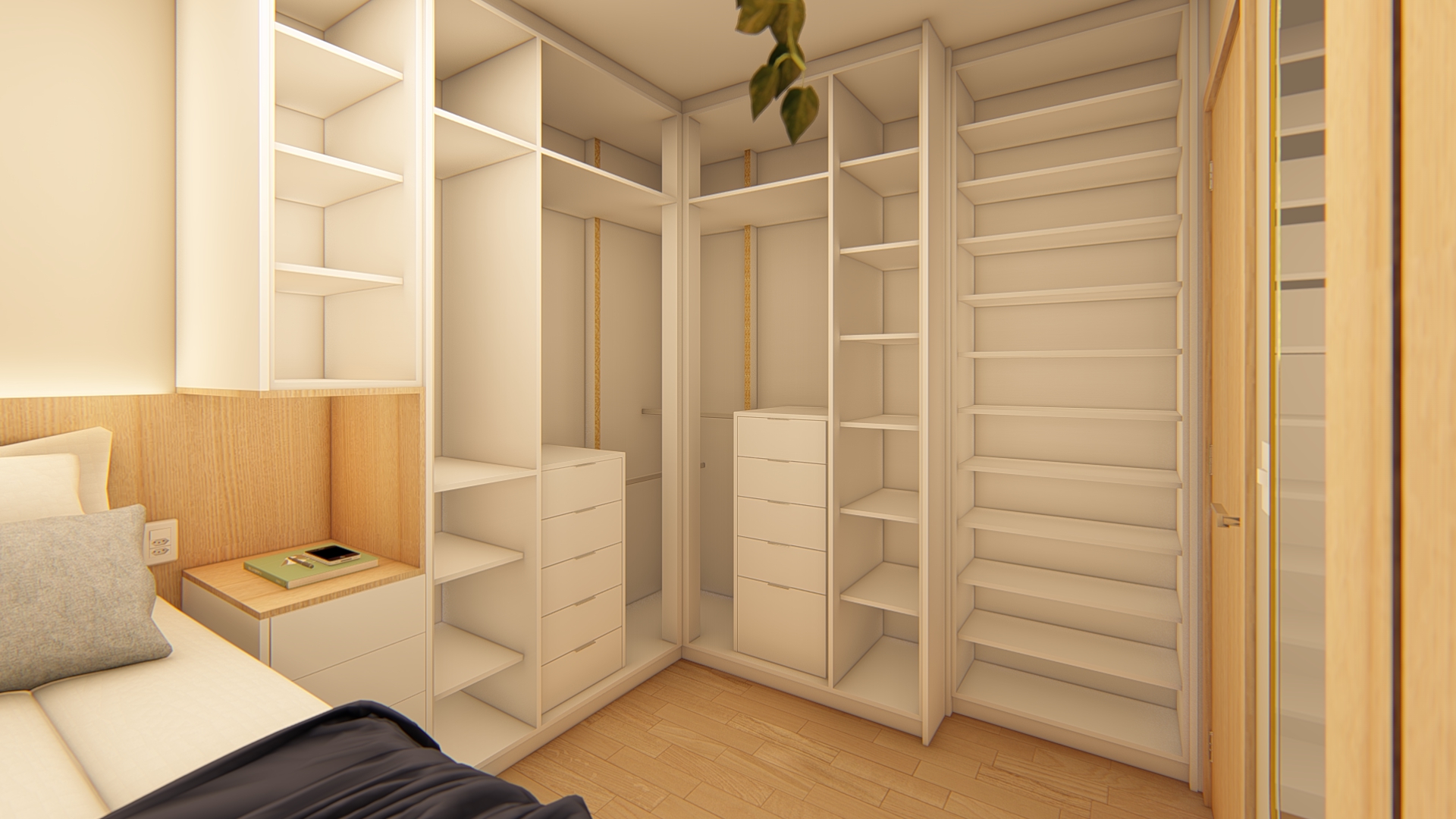 Este projeto tem uma peculiaridade muito interessante, pois inicialmente o cliente Ricardo entrou em contato com a Isa + Ortiz com a determinada demanda de realizar um projeto de marcenaria do seu guarda-roupa de casal em formato de “L” para posicionar no canto do seu quarto.