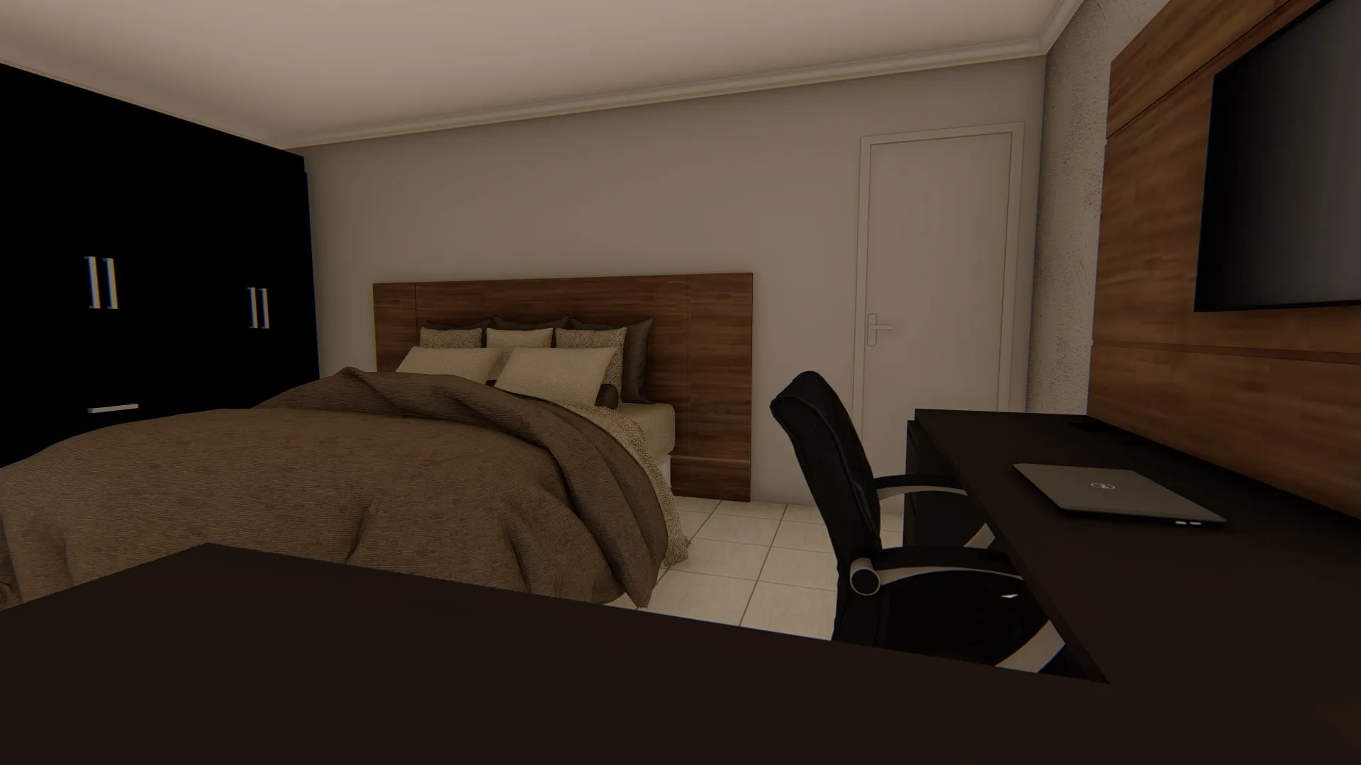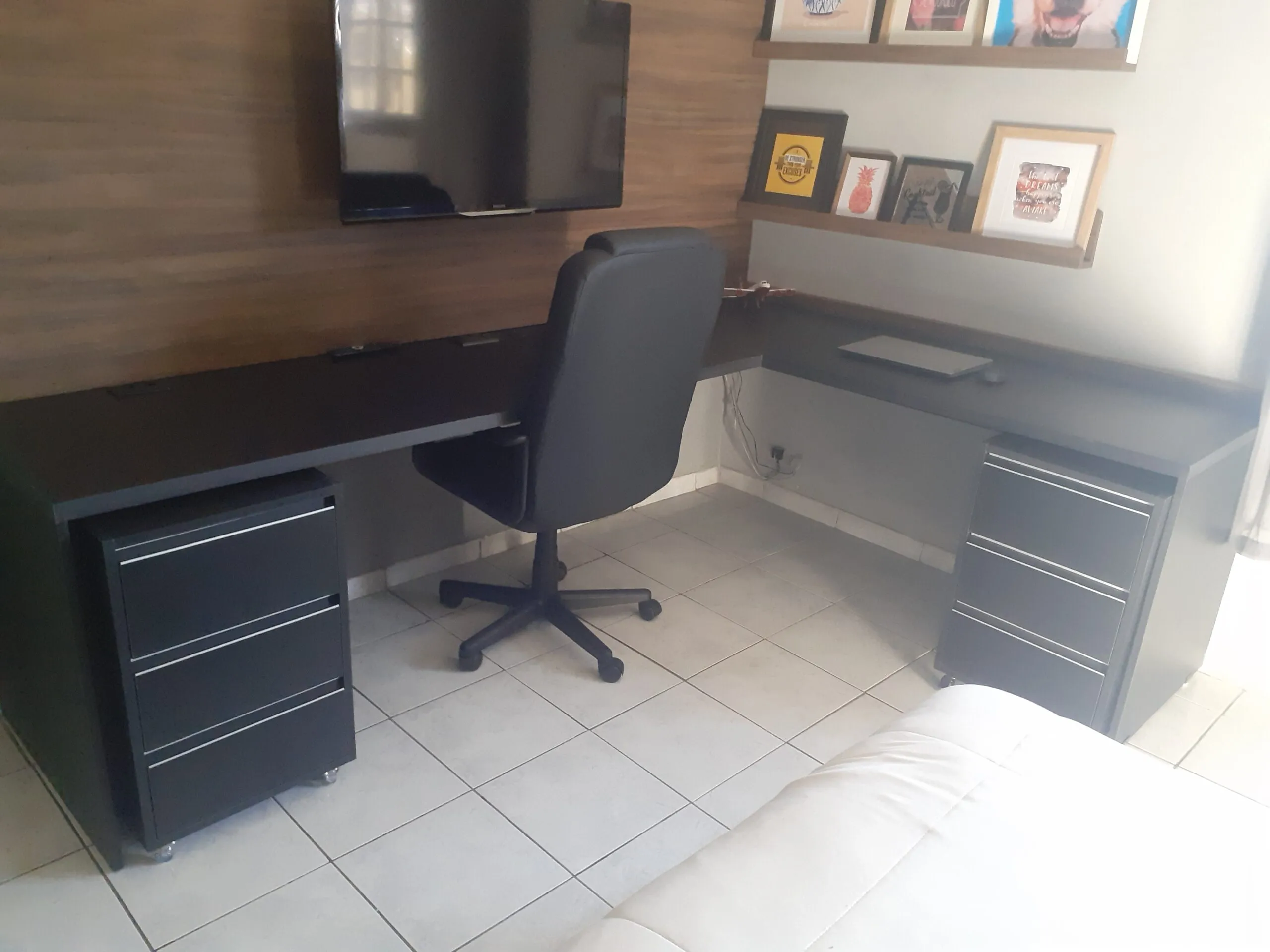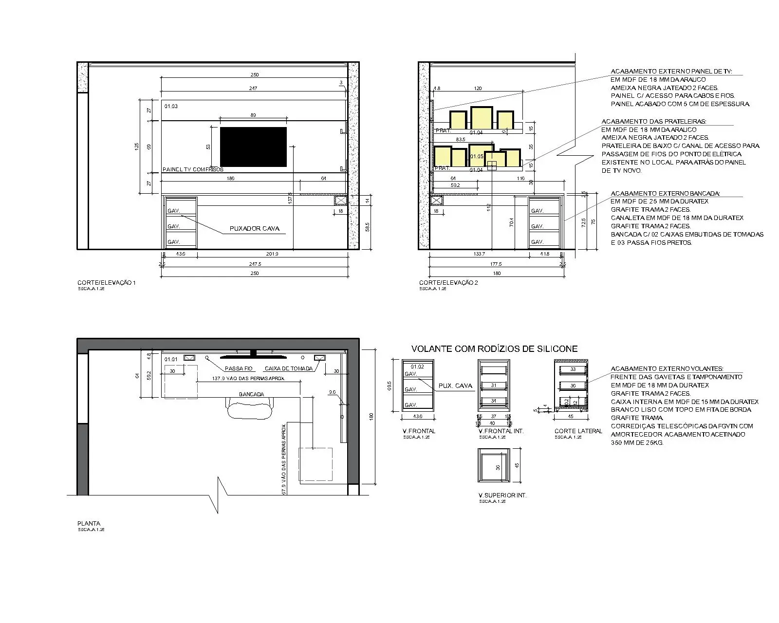 Projeto de marcenaria de bancada, painel e volantes. Acabamentos dos painéis em MDF Ameixa Negra da Arauco, bancada e volantes em MDF Preto Texturizado da Duratex, as gavetas dos volantes têm corrediças telescópicas com amortecedores para fechamento suave.