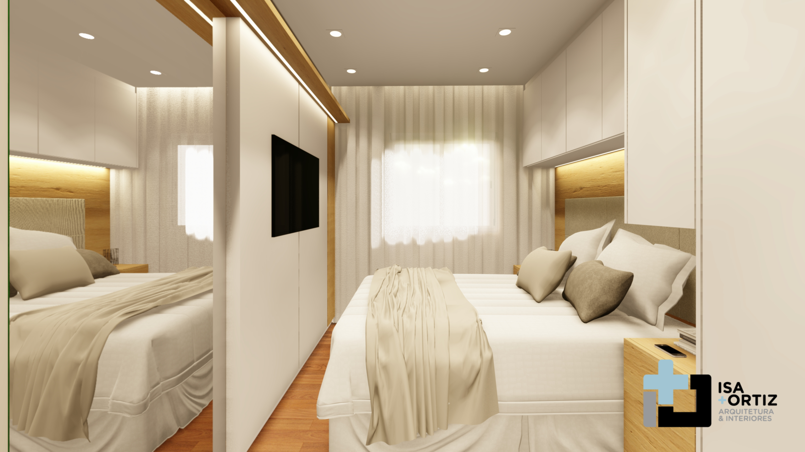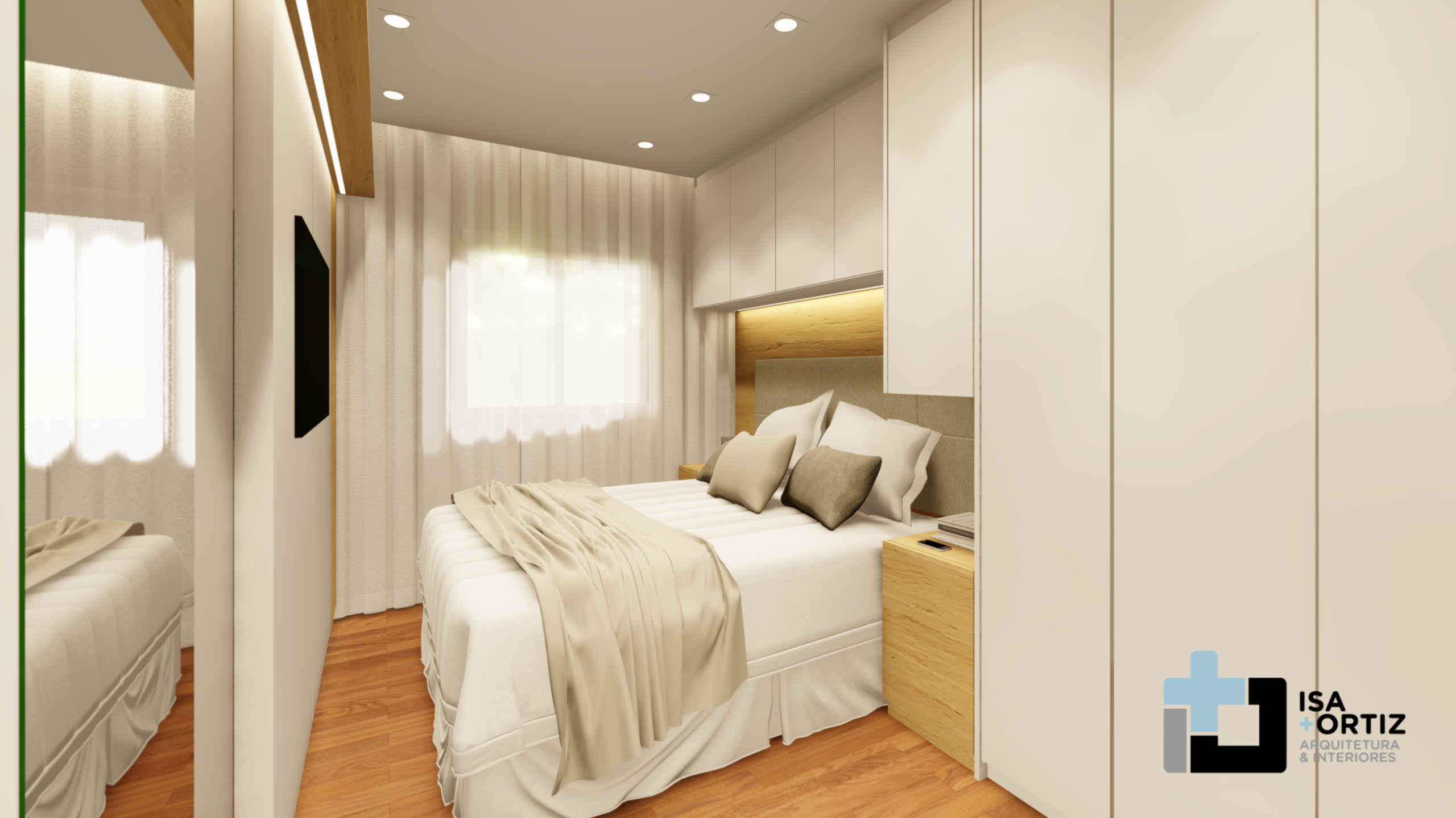 – Iluminação com plafon central fixado no forro, spots no forro, fita led no cortineiro e fita led na marcenaria;