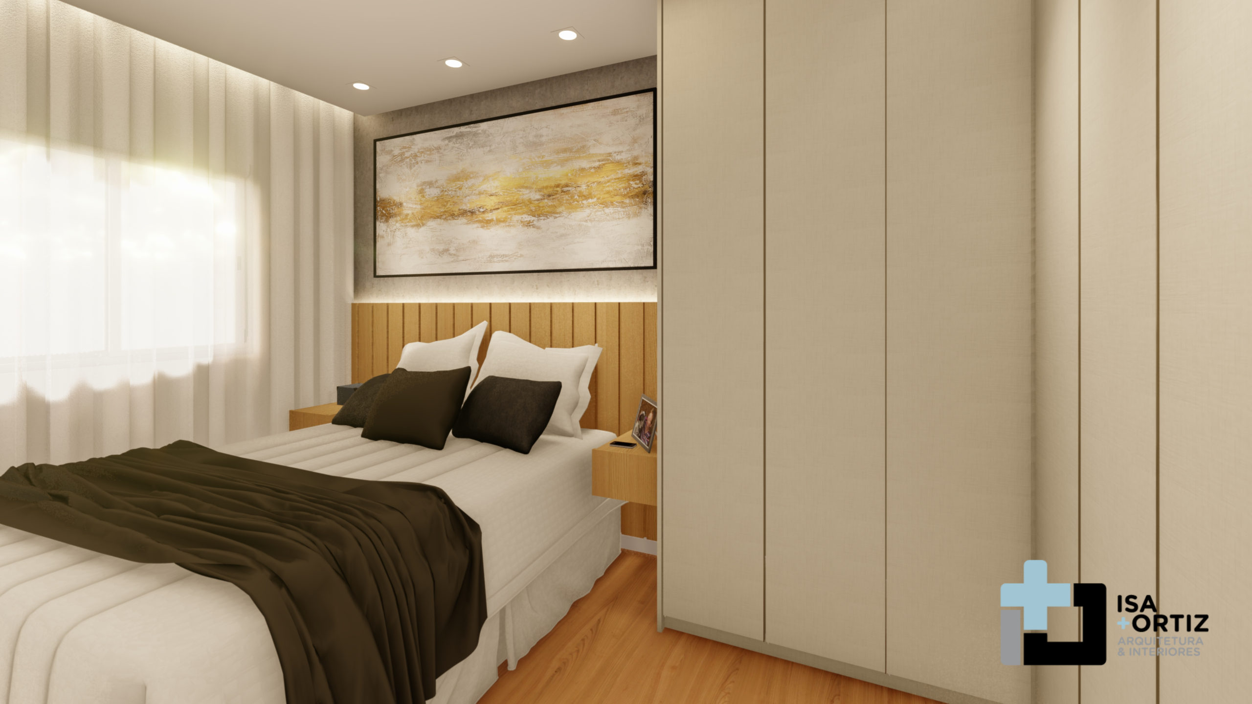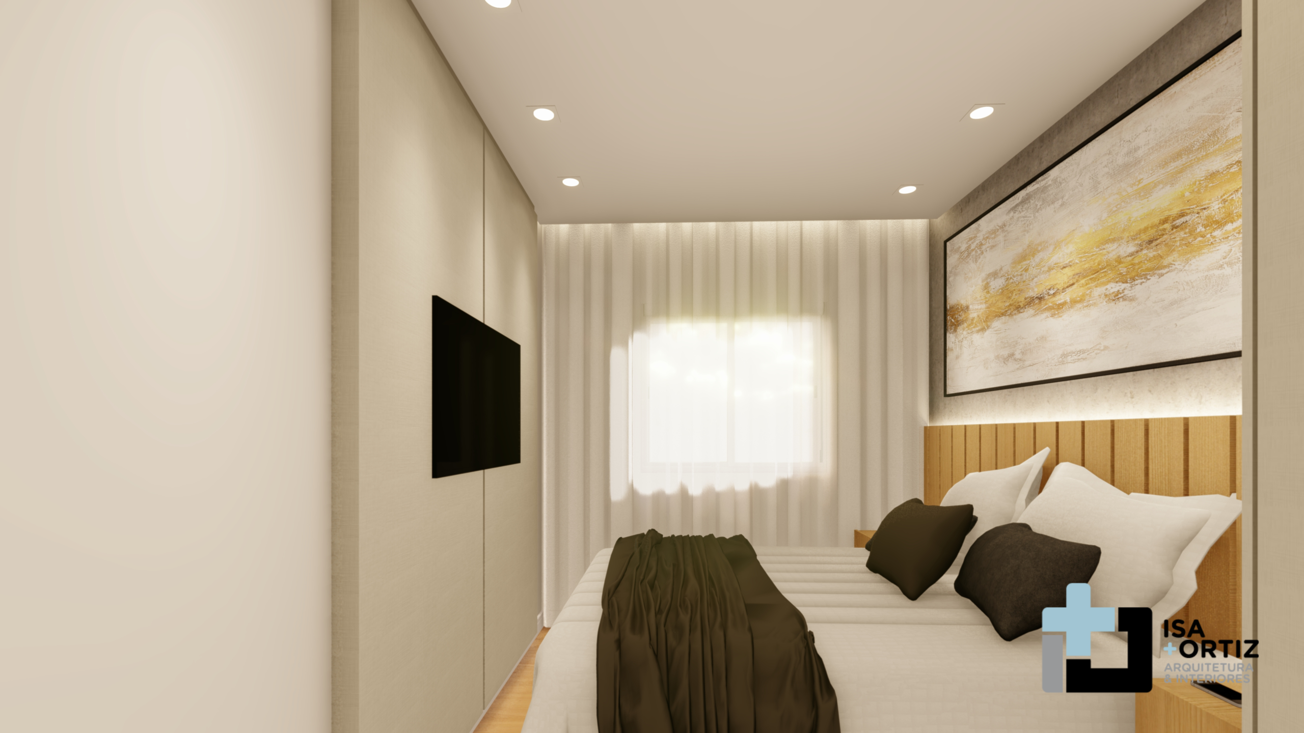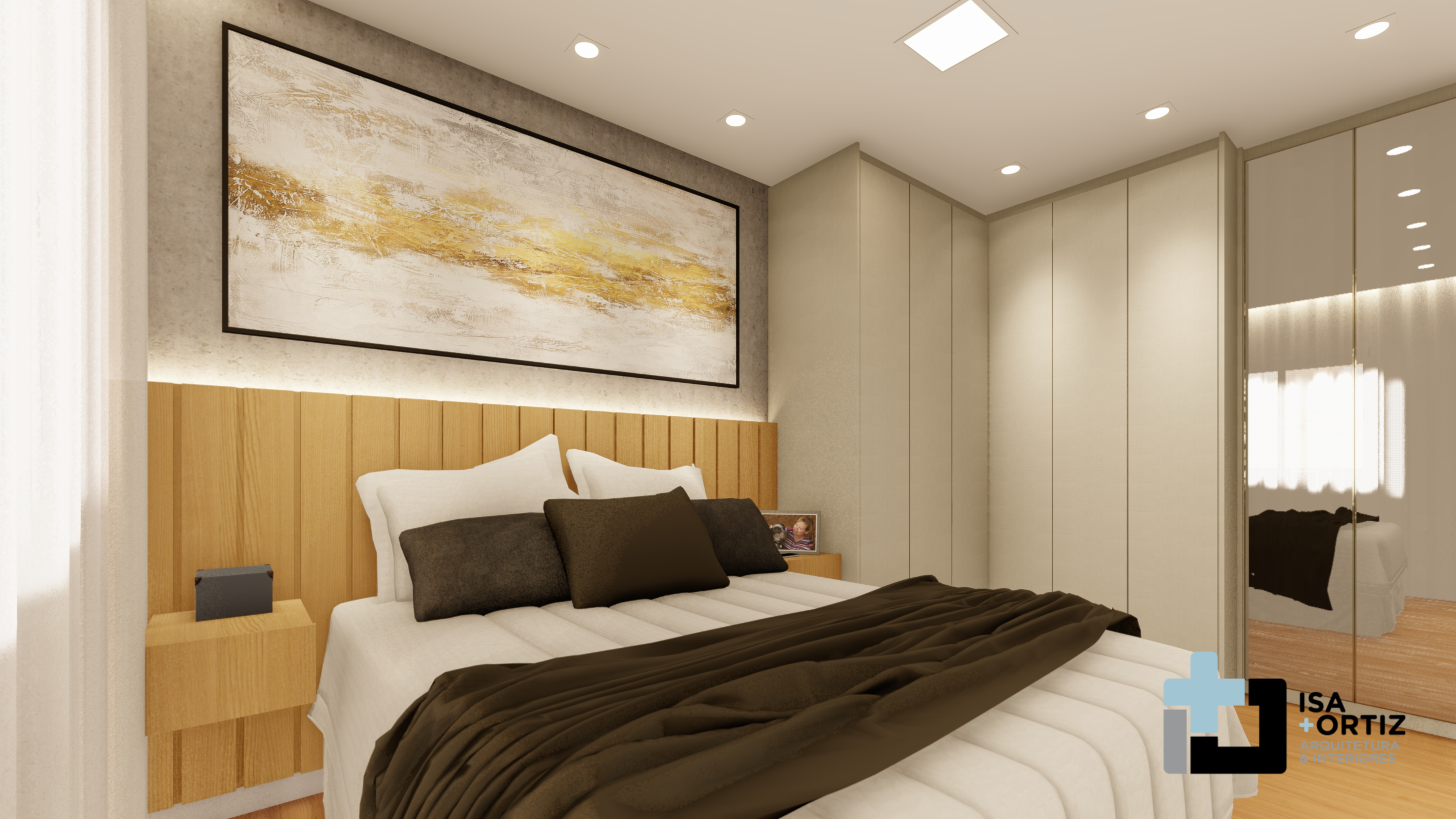 – Iluminação com plafon central fixado no forro, spots no forro, fita led no cortineiro e fita led na marcenaria;